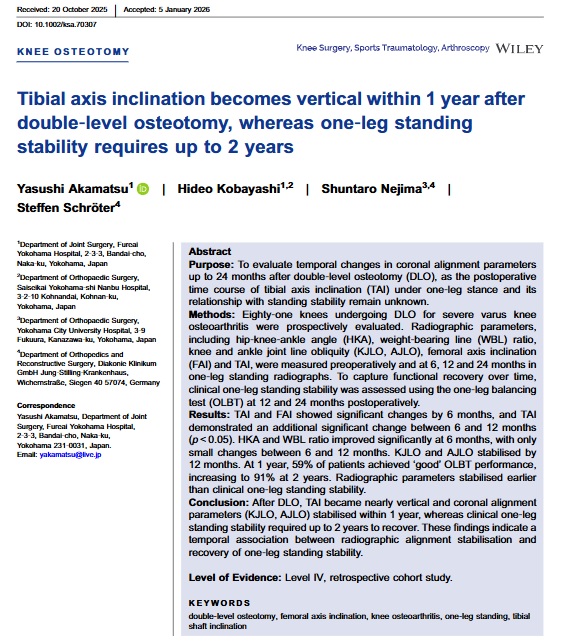 2026年1月5日 Knee Surgery, Sports Traumatology, Arthroscopy (KSSTA) というスポーツ・整形外科関連トップクラスの英文雑誌に私の書いた論文が受理されました。何歳になってもうれしいものです。内容は、「DLO (Double level osteotomy: 大腿下腿骨切り術) 後の冠状面 (正面) アライメント、とくに片脚立位でのTAI (Tibial axis inclination: 脛骨軸の垂直化) の経時的変化と立位安定性の回復過程を81膝で前向きに評価した。TAIは術後1年以内にほぼ垂直化し、KJLO (Knee joint line obliquity: 膝関節面の地面に対する傾斜で正常ではほぼ0°) ・AJLO (Ankle joint line obliquity: 足関節面の地面に対する傾斜で正常ではほぼ0°) などのX線学的指標は早期に安定した。一方、OLBT (One leg- standing balance test: 片足で何秒立っていられるか: 正常では30秒以上) による片脚立位安定性の回復は遅れ、十分な改善には術後2年を要した。」です。OLBT を各時期での復帰の目安にしていこうと考えています。